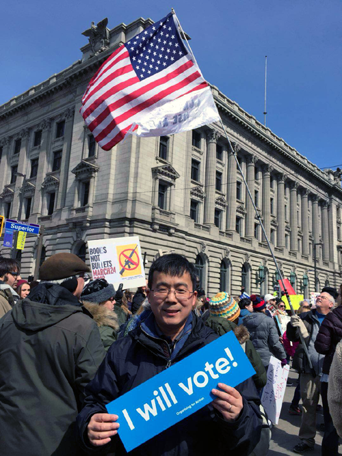 遊行隊伍經過的路邊和大樓里有不少圍觀的人,不時大喊爲我們助威,還有人化妝成川普的形象諷刺現政府對控槍的不作爲。