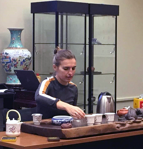 本次活动,孔子学院为大家准备了包括西湖龙井、信阳毛尖、六安瓜片等绿茶、乌龙茶、红茶、白茶和普洱茶,分别放在盘子里、陈列在桌子上,供大家首先通过看形状、闻味道,对不同品种的茶叶有一个直观的印象。每种茶叶又都事先冲泡好了一些用以品尝,观茶色、品茶汤,教室里弥漫着茶叶的清香。在讲解环节,丁笑丛首先介绍了中国茶的历史、分类和保健功效以及,饮茶过程中的一些礼节和习惯,随后李顺琴向大家演示了奉茶时应该注意的礼仪。当被问到有没有尝试过中国的茶、最喜欢哪种茶时,一位并没有太多中文基础的社区居民直接说出了字正腔圆地“铁观音”,中国茶叶的受欢迎程度可见一斑。