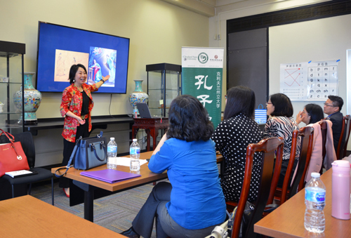 在上午的培训中,肯塔基大学孔子学院美方院长修华静注重提升教师们的教学能力。她以“两个真话一个假话”的游戏引入,告诉大家应该如何在短时间内高度概括重要信息。随后,修华静向大家介绍了21世纪美国教育新形势对外语教师提出的新要求。在21世纪,高层次归纳总结能力、协作能力、沟通能力和创造性解决问题的能力是职场中最重要的四项能力,这既是对教师本身的要求,又是教师应该在培养学生方面的关注点。在具体操作上,修华静简要介绍了逆向式备课、翻转式课堂等几种有效的教学方法,并以大量生动有趣的教学案例,深入浅出地介绍了如何把中文和其他科目结合起来、如何把中文教学融入到教育体系核心。结合自己的艺术背景,她又从中国水墨画和西方油画的对比中介绍了如何进行文化对比。对于中文教师本身,她希望大家能培养自己的高层次综合思考能力,并寄语:不要因循守旧,要勇于开拓。
