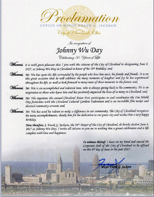 Johnny,這15年來他做過許多爲社區的好事,他擔任美華協會的主席,他是克里夫蘭亞洲節的創始人之一,在他忙碌的生活中始終沒有忘記他的夢想電影,再次恭喜他堅持夢想,期待他下一個電影。