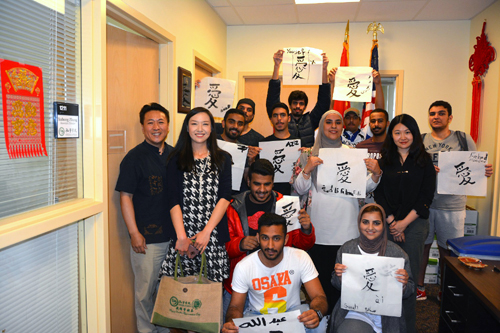 为了满足玛丽埃塔学院师生的要求,本次活动也特设了书法体验活动。讲授书法多年的李惠文博士向同学们介绍并展示了中国书法及文化知识,并指导同学们一笔一画地认真学习书写,用短短的时间完成了“十”、“人”、“木”的书写,最后每一位同学都兴致勃勃,带着饱满的情绪和爱意,完成了自己的书写作品“爱”。