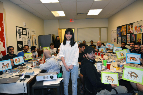 李雨霏学习绘画多年,精于多种现代风格绘画艺术,2016年跟随在孔院工作汉办公派教师来美国读高中,课余时间积极参加孔院及社区的文化传播活动。这次活动中她现场作画,用写意的笔法勾勒十二生肖图,栩栩如生,富有灵性,获得大家的一致好评。活动结束时,她还向每一位同学都赠送了自己的生肖画作。