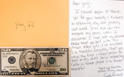 8月8日我在lifetime健身房更衣室发现一只小包,里面有手表戒指和项链等等,我就交给了健身房工作人员,几天后健身房特意打电话给我,让我到健身房找工作人员。我收到一份感谢信与50美金谢金,失物主人写了感谢卡: