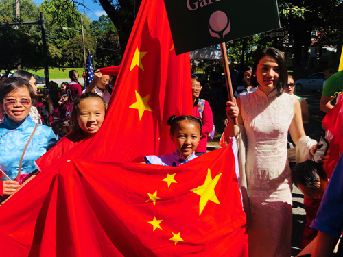 當日中國花園有近一百多位中國志願者在遊行的隊伍里,現任中國花園董事長倪舉凌夫婦,他們全家三代人出場,當代中文學校的湯年發董事長也帶來了學生和家長一起在遊行的隊伍里。
