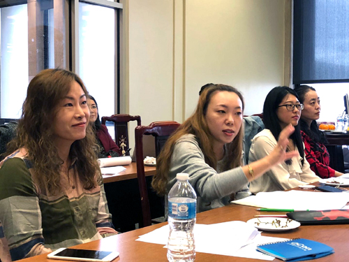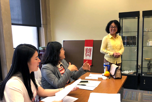 在“反向教学设计”的主题培训中,海伦(Helen)老师首先简单讲解了相关理论和方法,并用设计好的模板、样板对老师们进行了设计训练。训练根据反向设计的三个阶段展开:明确总体教学目的、明确学生学习结果形式、根据目的和结果设计教学。老师们分阶段进行分析、讨论、设计,每个阶段设计结束后,海伦组织受训教师进行积极的讨论,在总结阶段,海伦特别强调了明确教师角色、采用合适策略、强调学习成果和证据、多种手段进行学习成绩评估。从实战出发进行培训是克利夫兰州立大学孔院教师培训的一大特色,老师们纷纷表示,这种务实性培训节省了时间、提高了效率。