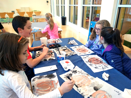 除了这些游戏吸引孩子的兴趣外,我还结合了中国和美国的节日,开展了一系列活动,如中国的国庆节,我们一起贴上了中国国旗“纹身”;中秋节,我们讲了嫦娥后羿的故事;万圣节和感恩节,我们一起画中国画南瓜。