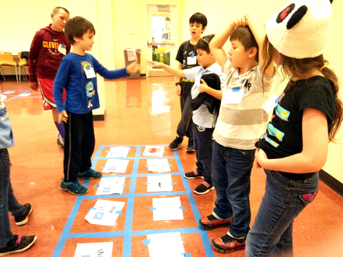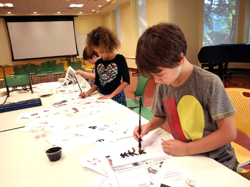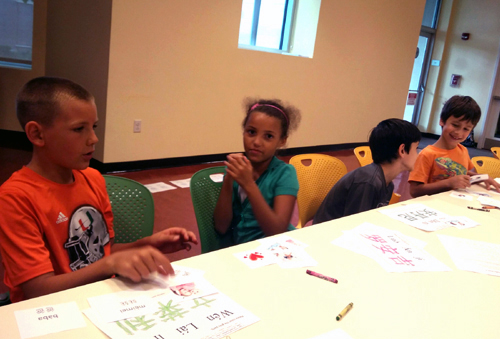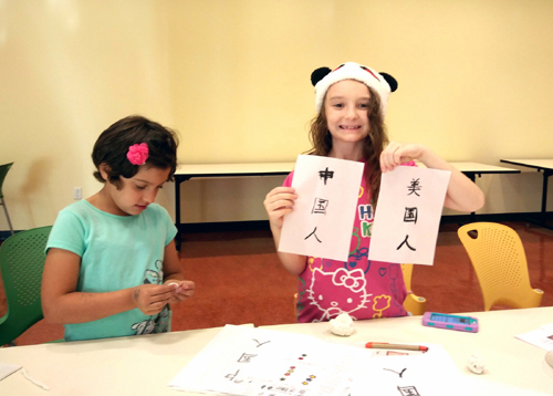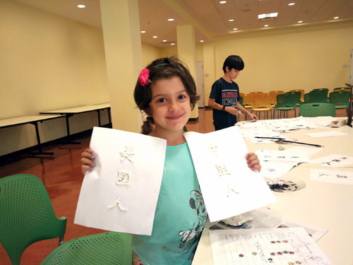 游戏活动将孩子们的参与热情推向高潮。孩子们逐一转起手帕、用“神奇的筷子”夹食物、学习用毛笔写自己的中文名字、匹配汉字与图片、跳房子、看文化展板了解中国文化,用自己参加活动积累的贴画换礼品,孩子们玩得不亦乐乎,尽情享受汉语学习带给他们的无限快乐。有的家长对活动称赞不已,有的家长用感谢卡表达了对孩子汉语学习进步的欣慰与对我的感谢,图书馆对该汉语项目给予了很高的评价。我看着孩子们快乐的笑容,心里充盈而满足。