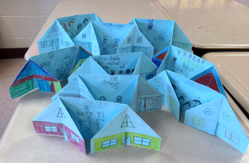 在學習“家庭成員”或“房間佈置”主題時可以使用這個活動。學生可以通過折紙,先折出房子,再根據自身情况和喜好繪製房間、佈置房子、介紹家人、與小夥伴們進行交流。通常這個活動在一節課上完成是比較困難的,因此,我就會把它放在“碎片”時間。學生可以根據自身情况去完成自己家的介紹,通常這個主題學習結束了,這個小的活動項目也基本完成了。