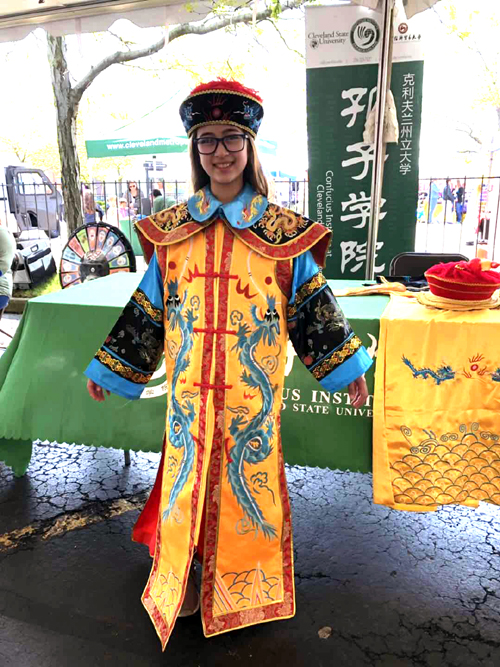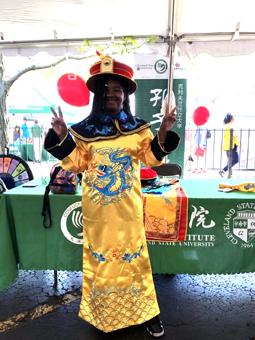 作为社区文化宣传的一部分,克利夫兰州立大学孔子学院每年都积极参与其中,参与展示中国的文化与活动。活动分为两天,5月18日由孔院教师王文君老师和志愿者虞红敏老师共同设计了主题为“皇服展”的中华文化服饰活动,大批民众纷纷上前一睹“皇室”风采,并亲自“过把瘾”,留下难忘的一瞬间。5月19日由孔院教师郭宇飞和李顺琴两位教师共同开展了中华剪纸文化活动,无论你是稚嫩孩童还是耄耋老人,无论你是什么肤色与种族,都可以用那把小小的剪刀飞舞出自己的作品,折叠再折叠,打开后的美丽窗花惊艳了自己也惊艳了朋友。更有华裔表示这项传统的手艺要发扬光大,让它继续传承下去,留给子孙后代。