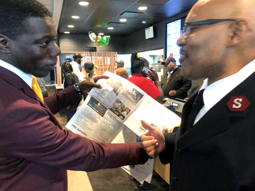 當日我對他説:在匹兹堡所有的麥當勞都貼有用中文字寫得感謝你光臨的廣吿宣傳,他説他十分樂意幫忙宣傳。