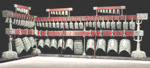 特別需要介紹的是編鍾國樂的主角——“編鍾”。早在3500年前的商代,中國就有了編鍾,常用于徵戰、朝見或祭祀等活動。至今爲止所發現的最引人注目的編鍾是1978年在湖北隨州的一座戰國時代(約公元前433年)的曾侯乙墓出土的“曾侯乙編鍾”。這套編鍾以及當時曾侯乙墓中出土的其它大量珍貴文物現陳列于湖北省博物館。曾侯乙編鍾由19個鈕鍾、45個甬鍾,外加楚惠王送的一件大镈鍾共65件組成。鍾及架、鈎上共有銘文3755字,內容爲編號、記事、標音及樂律理論。這套編鍾的銘文,是一部重要的中國古代樂律理論專著。全套編鍾音域寬廣,音列充實,音色優美。每件鍾均有呈三度音程的兩個樂音,因而被音樂學家稱爲“雙音鍾”。全套鍾音域寬廣,跨五個八度,又一個大二度,最低音C2,最高音D7,比現代鋼琴音域高低各差一個八度。全套編鍾具有深沉渾厚的低音、圓潤淳樸的中音和清脆明快的高音。編鍾的裝配、佈局,從力學、美學、實際操作上,都顯得十分合理。全套鍾的裝飾,有人、獸、龍、花和幾何形紋,採用了圓雕、浮雕、陰刻、彩繪等多種技法,以赤、黑、黃色與靑銅本色相映襯,顯得氣勢宏大,精美壯觀。