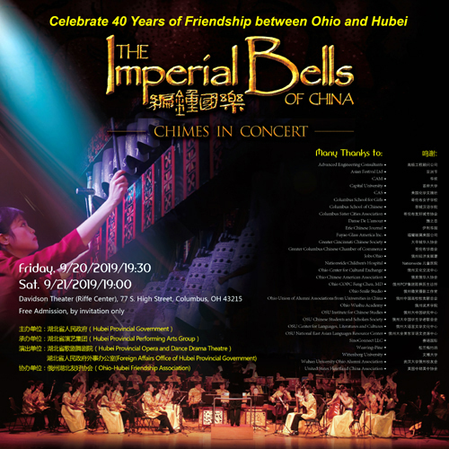 爲紀念中國湖北省與美國俄亥俄州建立友好省州四十周年,“湖北編鍾國樂團”將于2019年9月再度訪演美國,將于9月20日、21日在俄亥俄州哥倫布、24日在辛辛那提兩地演出,爲觀衆呈現一台獨具特色的《編鍾國樂》音樂會。