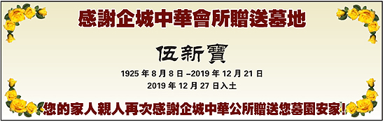 伍新寶家人親人感謝企城中華會所贈送墓地