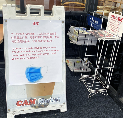 隨着新冠肺炎的疫情加重,各個超市也開始做相應的保護措施。克利夫蘭華欣超市在進門的地方放了一個大大的中英文吿示牌,寫道:爲了您和他人的健康,凡進店購物的顧客必須戴上口罩,對於不戴口罩的顧客,本店將拒絶提供服務,非常感謝您的配合。華欣超市提供口罩,每個售價一美元。
