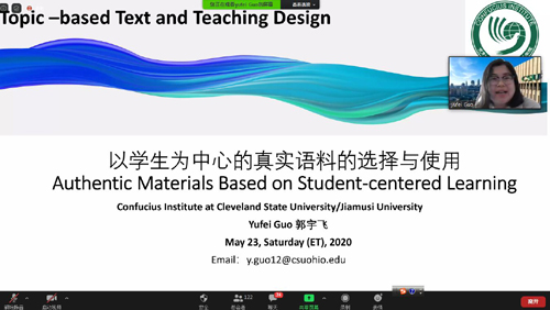 当地时间2020年5月22—23日,克利夫兰州立大学孔子学院成功举办线上教学研讨会,来自美国和中国的22位教学专家作了教学研讨报告,吸引了来自美国、中国、新加坡、泰国、德国、巴林、意大利、英国、加拿大、瑞士、马来西亚、菲律宾、澳洲等13个国家的参会者,两天会议出席达240人次。会议由克利夫兰州立大学孔子学院核心教师/教育项目助理院长李惠文博士主持,孔院美方院长徐岩、中方院长黄立伟、办公室负责人何文彦以及孔院全体教师全程出席了研讨会,纽约州部分孔院中方院长携孔院教师参会。另外,克利夫兰州立大学孔子学院九名本部和中小学教师针对“主题式教材与教学设计”分别作了报告。