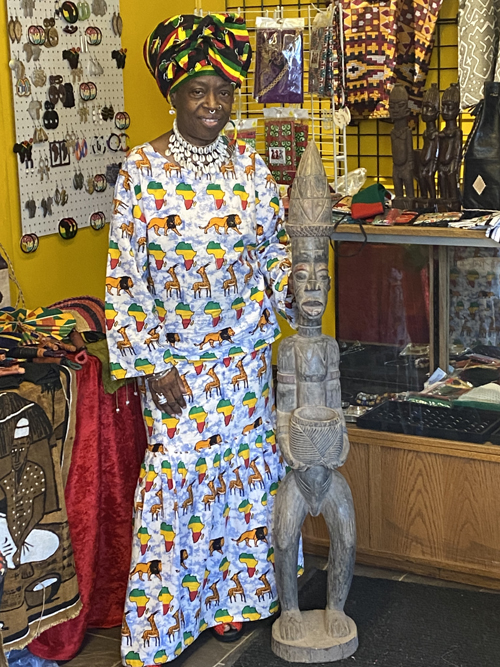 FASI'S,這家店出售傳統非洲衣物和首飾,店不小,後面還提供給孩子們上樂器“鼓”課程,店主Queen非常熱情,知道我是做中文報紙的,她説4點有敎小孩練“鼓”,因爲我等不到4點,她馬上説:明天她的店有重要活動,12點開始,都是非裔社區很重要的女人,我馬上答應店主説明天一定來,這個活動讓我認識Arjoy
