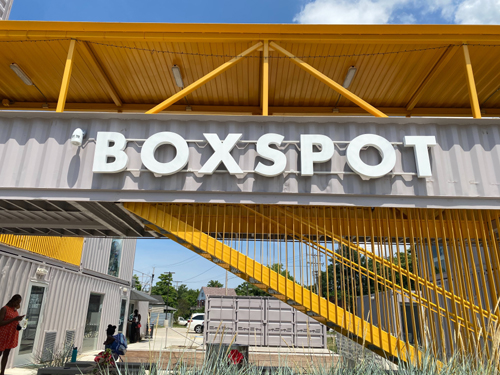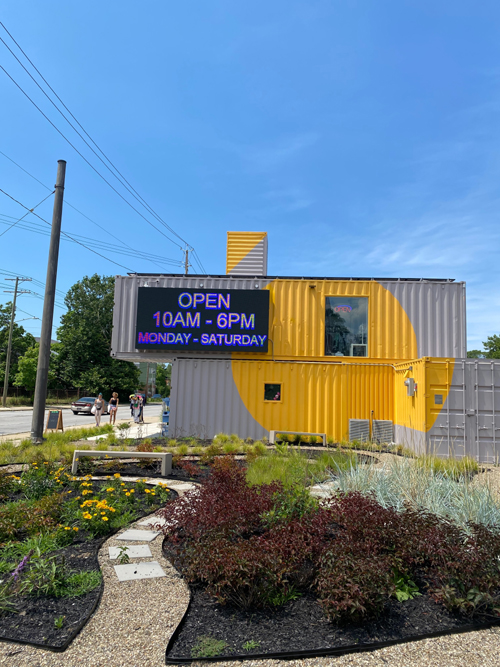 (小巧玲瓏),整個建築是貨車改裝,兩層樓,小小的一個個空間,有做服裝,美甲美髮,首飾,小外賣飯店,還有一個糖果店,主要是這個小商城很有創意,它們設立一個室外小電影院,不放電影可以舉行小小演唱會,租金$200-$500,不僅給人提供就業機會,而且也繁榮和熱鬧了左右鄰居,也讓環境煥然一新。我要找負責管理的人,一位員工吿訴我去Larchmere