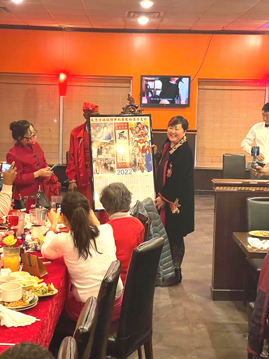 晩會上有一個重要環節,是伊利華報送給熱心支持華報的方媽媽一個驚喜:一份精心準備的印有方媽媽照片和2022年年歷的畫板,畫板上表述了伊利華報對方媽媽的衷心感謝和新春祝福。
