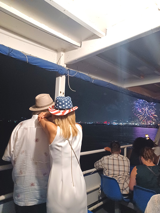 船上衆人向船尾跑去,回首一望,煙花近在眼前。浦瑛姐和我也起身隨衆跑到船尾,仰首翹望船尾旗杆上星條旗在絢爛綻放的煙花襯托下自豪地飄颺着。浦瑛姐和我在星條旗下開始自拍,紀録着我們的瞬間:感恩我們在美國這片廣袤的土地上不期而遇!感恩我們在茫茫人海中的相擁而笑!夜空中絢爛的煙花,綻放着自由的生命力!神靈庇佑的星條旗,飛颺着我們永不磨滅的夢想….