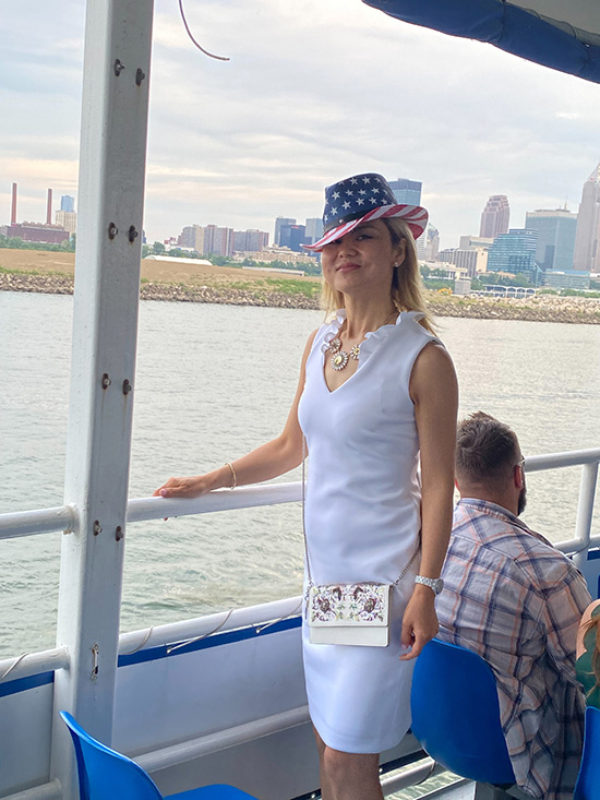 不知是何原因,今年有一種冲動,想好好慶祝一下美利堅的246歲,以表內心的感恩,感恩她的擁抱,感恩她的給予。浦瑛姐説她來美三十年,沒有特別慶祝過美國國慶。我邀請她一起上Good Time III的克利夫蘭環線游輪,進晩餐、看煙花、跳勁舞慶祝美國獨立日!很喜歡和浦瑛姐玩,她是一個非常能自我盡興的人!我們能玩到一起,嗨到一起。其實是受她的影響,我生活得也越來越有儀式感!這次特意買了個美國旗圖案的帽子,頂上示尊!
