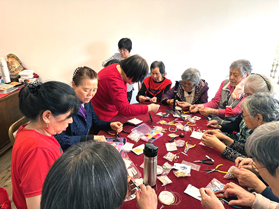 這一次的主要學習項目是製作耳環,大家在李老師的帶領下,首先學習了製作工具的種類與名稱,以及不同的用途和使用方法;其次學習瞭如何進行最簡單的耳環製作。在進行了十幾分鐘的實踐操作之後,李老師又敎大家更加複雜的穿珠吊墜技巧。之後,大家就八仙過海各顯神通,利用婦女會所提供的大量的製作材料和工具,展開了興緻盎然的製作比拼!別看老年公寓的阿姨們上了年紀,手上功夫一點都不慢。很多人都有很好的奇思妙想,無論是色彩搭配,還是設計搆圖,都能讓人耳目一新。