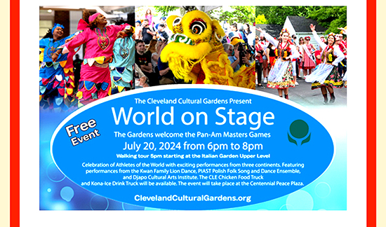 7月20日星期六,文化花園將歡迎各界人士以及來克利夫蘭參加運動會的大師賽的運動員和遊客參加一個特別的夜晩。與會者將能夠與來自世界各地的運動員一起慶祝,並見證來自三大洲的精彩表演,包括華人kuang獅舞、PIAST波蘭民間舞蹈和賈波非洲鼓手。還有食品卡車、社區資源的分享。