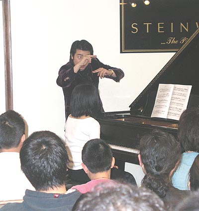 (鋼琴專賣店)爲鋼琴愛好者講課,他的講解風趣幽默,他用他獨特的身體語言敎學生,當日有八十多位學