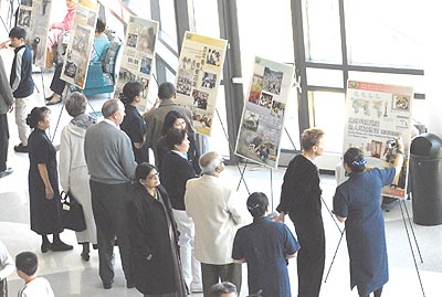 午後克里夫蘭的天空,一片藍天淡彩著片片白雲,映照著會場上藍天白雲的慈濟志工,大廳人聲鼎沸,師兄姐們身著西裝、柔和忍辱旗袍、或藍天白雲志工服,穿梭在近五百位的佳賓中,無論識與不識皆親切問候;而靜思文物展示處,早已聚集許多人潮,幾位相約而來的太太,打扮入時,為選購環保碗筷時,傷起惱筋,「粉紅色好呢?還是藍色好呢?哎!眞難選擇!」當然最後她們決定藍色及粉紅色都帶回家,靜思文物實在都太美了!