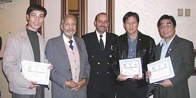 图:從左到右:獲奬者陳國鋒,克城最年長義工JAMES(92歲)第三分局負責人ANDY GONZALEZ, 歐陽永兆和何明
