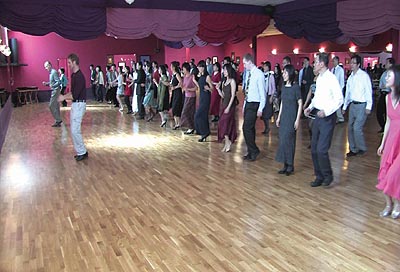 人已來了不少,舞池里已有人開始跳起來,後來者陸陸續續將九十人的位置坐得滿滿。只見舞池中大家舞得好歡快:水紅的絲綢長裙,白色的珠光裙褲妖嬈多姿,紫色的蓬裙,銀色的短裙俏麗活潑,蘭色的晩裝,黑色的舞裙高貴典雅,還有一件白色的無袖旗袍,鑲着金色的邊綉着金色的花,好中國也好雅致!鬢影交錯,燈光下大家舞得美不勝收。。。