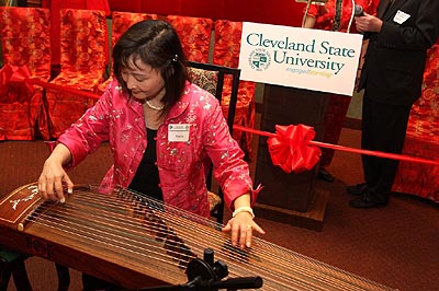 稍後,克利夫蘭孔子學院精緻的銅牌亮相和中國首都經濟貿易大學贈送孔子玉雕讓晩宴進入了高潮。晩宴還特意安排了古箏及二胡特色民族樂器的演奏,優美的國樂旋律讓來賓享受了中國音樂藝術之美,席中幾位資深的中文老師,更即興在古箏伴奏下,表演了「茉莉花」與「小城故事」等歌曲以娛嘉賓。