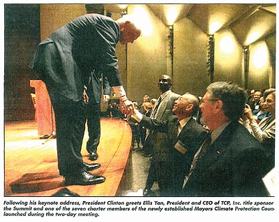 Following his keynote address, President Clinton greets Ellis Yan,