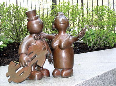 兩樓之間地下相通,地上則爲小小庭園。有蔭蔭緑樹,小小水泉,養著金魚;有鋼筋編制的椅子和圓桌,供讀者或行人休息。最有意思的數十個小銅人,沒鼻子,以兩點爲眼,橫線爲嘴,造型十分可愛,(如圖2,3)。小銅人或單人,或成雙,相映成趣。在庭園里,在東樓靠路邊,都有間隔有距的成雙銅人。似在邀請你和你的伴侶坐在他倆中間,一起合影。友人來訪,我總要帶他們來此與銅人留影,讓他們高興之餘,又多得了一對銅兒女。圖書館和設計者的良苦用心,讓來訪者留下會心一笑,報以贊賞之語。