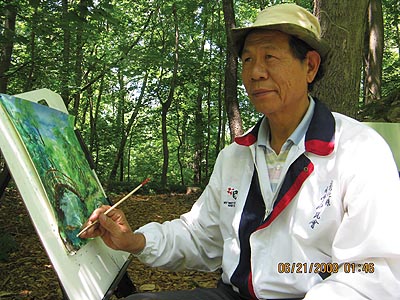 廖進財先生:出生於台灣,從商後轉入藝文界工作至今已有數十年的書畫經歷。2002年受邀中國福州畫院舉行書法個展250件盛況空前,甚獲好評。在台個展計十二回,亦曾擔任社區大學書法指導,也擔任過台灣全國書法比賽評審。作品參賽得獎不計其數,在中國獲一等獎,特等獎,優等獎多次,在台灣亦有書法創意特優第一名,仁翁盃第一,等佳績。著有廖進財書畫專集四冊,亦曾在彰化藝文季刋發表文藝創作。使筆濡墨開書法漫談骨文美藝等多篇書法繪畫作品廣受大陸、美、日、馬西亞香港等友人收藏。他的生活以書畫為樂,以畫會友,廣結藝緣。使生活多姿多彩,遊美於紐約,所見高樓林立有感「仰望雲樓側如峰,造景高低各異同,未見女神眞面目,祗緣身在紐城中。」自由經濟發達締造的奇景,仰觀大樓,引頸側臥的印象永難忘。我的父親熱愛大自然,他珍惜生命中的每個時刻,將所見所聞,描繪呈現在他的書法和繪畫中。自從我們旅居到美國中西部,就一直盼望能有機會和父親一同享受神所創造這麼優美的景緻,相信透過他的眼光和巧藝,能夠將這些都捕捉記錄下來。感謝主後的今天成全了我們的心願,使我們能夠盡一點兒女的心意不僅使我們享受與父親團聚的快樂,也讓父親能將他的書畫與在美的友人分享。