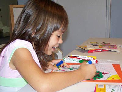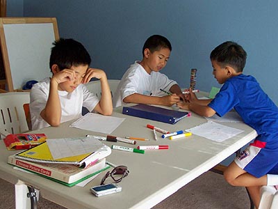 於是,不斷地啓發和引申他們的這種思維,將之在孩子們遊玩的輕鬆狀態下發揮出來豈不是財富?再能按孩子們不同的中文水準分工協作,用中文翻譯、用中文自己講解畫中的故事。再進一步,有了畫面以後,自己配上文字,有的文字功夫好一些的,邊向老師問生字邊寫他們能表達的故事。這樣下來,一天一天,聰明的孩子們在進步着、自信着、也暗中較勁着……