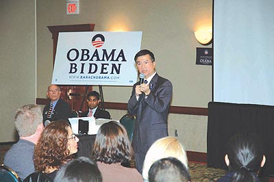 當志願者的兒子Kevin爲這一次宣傳活動做了大量的準備工作。駱家輝在演講前接受了本報記者半小時的採訪,他希望通過本報讓華人社區更多的選民以及關心美國未來和中美關係的華裔朋友來瞭解美國總統候選人Obama和他的施政計劃。