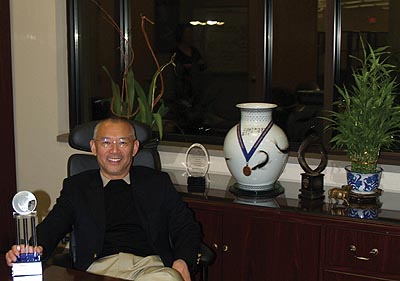 Ellis 嚴先生手持伊利奬杯祝福華報 |