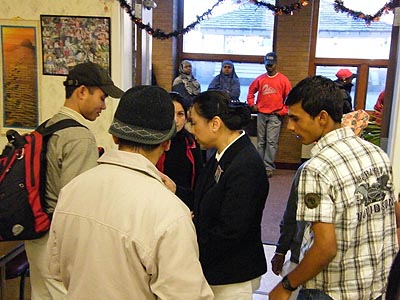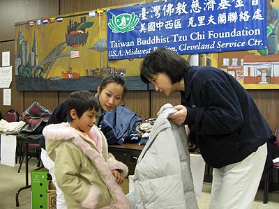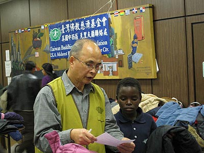 先由社區中心的職員幫他們登記, 之後, 便由慈濟志工引領 , 一位志工照顧一位難民, 帶領他們到所屬攤位, 幫忙他們選擇一件合意的大衣,