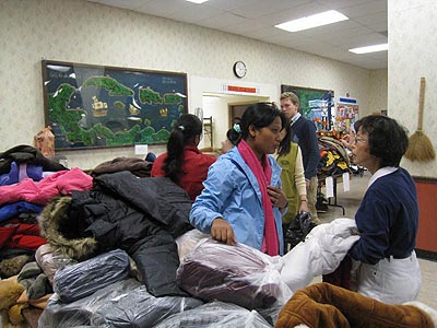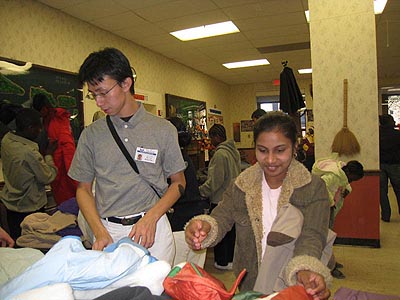 分為男、女、小孩和嬰兒四個攤位. 並迅速的把還未分類的大衣摺好, 順著尺碼排列在各單位上. 在志工們忙著佈置內場時,