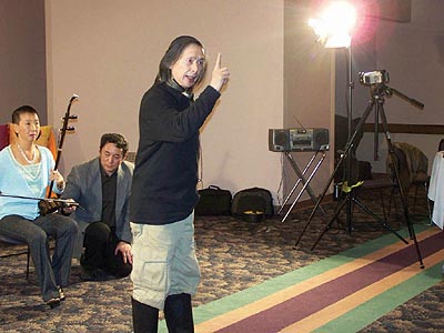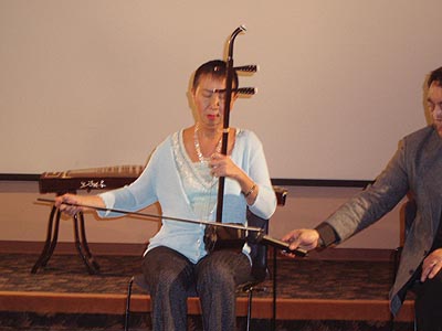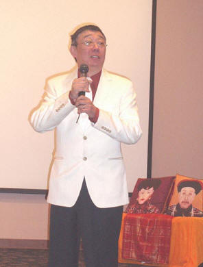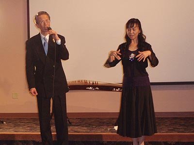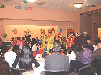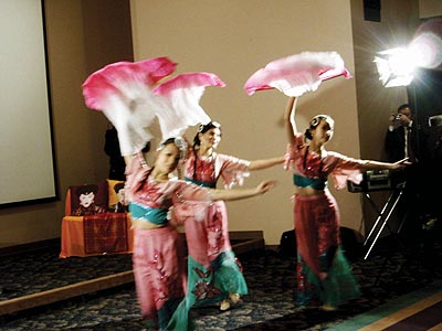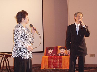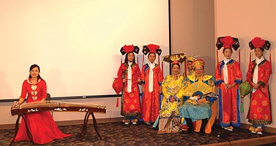 晩會伊始,一聲“皇帝駕到--”,音樂響起,身着龍袍的皇上和皇后帶着宮女緩步來到現場,在電影里才能看到的皇宮的裝束和六位演員惟妙惟肖的扮相立刻感染了嘉賓,使氣氛熱烈起來。皇上皇后坐上寶座後,是歌舞娛樂,湯箏爲來賓演奏了古箏曲,她的演奏技藝嫻熟,手指飛舞在琴絃上,把嘉賓帶入忘我境界,記者注意到,站在湯箏身後的“小宮女”表情專注地看着湯箏的表演,全然忘掉了自己的角色,像一個正在虛心上家敎課的小學生。在Amy