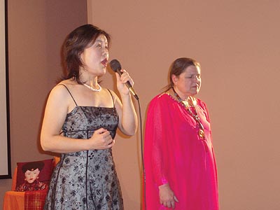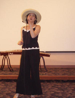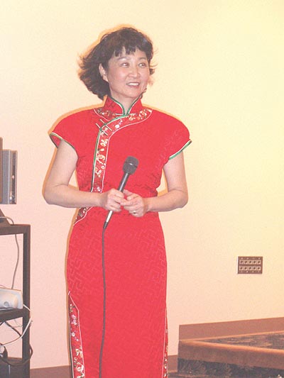 在接下來的晩餐中節目繼續進行,在匹兹堡潘嵐小姐的現場主持下,大家欣賞到了一系列形式多樣的表演,精彩紛呈,華報的好朋友匹兹堡盲人女敎師凱文女士演唱了《我愛你中國》和《小河流水》以及《紅梅花兒開》等中文和俄文歌曲,贏得在場觀衆的熱烈掌聲。著名詩人黃翔專程前來參加這次活動,他帶來詩歌朗誦《今生有緣》時而慷慨激昂,時而輕聲細語並配以豐富的形體動作,使得在場觀衆大飽耳福和眼福並被他的激情強烈感染。原中國中央樂團的專業女高音歌唱家苗歌和本報編輯BEN