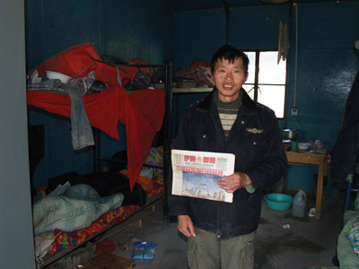 這位姓李的民工,他的長相和他的實際年齡相差很大,他才三十出頭,因爲他沒有到現場去看演出,只是站在他的房間門口在看,他同意我進他的房間,他説他十分滿意他現在干的活,他期待他今年春節回家和家人一起過節,因爲不是每一個民工都可以回家過節,工地不能因爲過節停工二個星期。我看着這凌亂的房間,沒有暖氣,很薄很髒的棉被,看着他們打熱水都排着很長的隊,不過他們仍然有着自己的快樂,因爲這位李民工吿訴我,他可以將他今年打工掙的一萬以上的工錢帶給家里過年,全家期盼他早日回家。