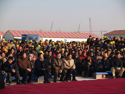 民工們在寒風中觀看慰問演出,前來看望他們的各級領導也座在他們當中
