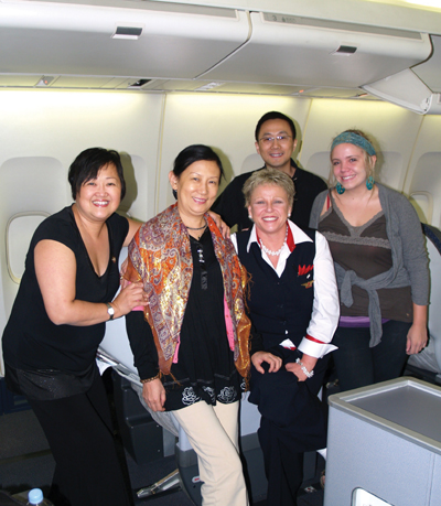 當日在商務艙的還有一位來自匹兹堡華報讀者馬瑞琪博士,他也認出我在今年春節帶盲人凱文上台和來自中國的歌唱家王莉一起唱的我愛你中國。