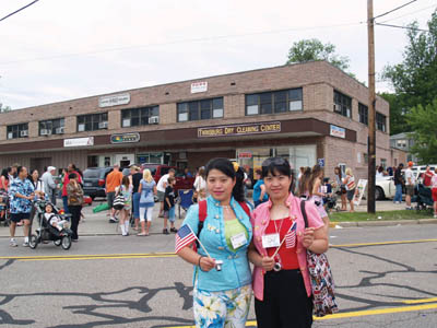 今年有一對身穿傳統中國服裝的華裔姐妹也在出現在遊行的人群中,當她們得知華報要採訪她倆,十分興奮,她們還到華報辦公室做客,第二天和華報朋友一起在寶龍飲茶,她們十分高心,説眞沒有想到第一次來美國實現了她們十年的夢想,而且還交上了新的朋友。