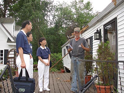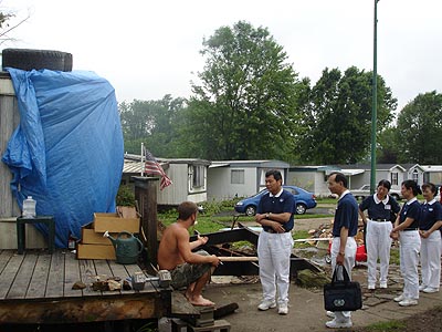 對志工問他有什麼需要幫助的話,好像聽而不聞。他說他在木材行每天要工作九個半小時,所以要完全修好這個房子可能要一段時間,不過即時是一年或兩年他也會有信心把它修好。在他身上完全看不出一般災民在大難後的悲情與沮喪,剎那間,志工們深深地感受到美國人兩百年前不屈不撓的立國與拓荒精神。