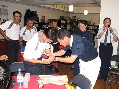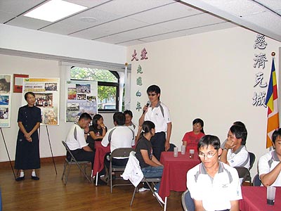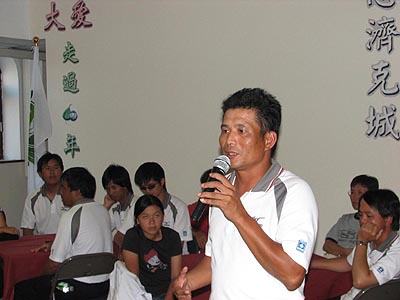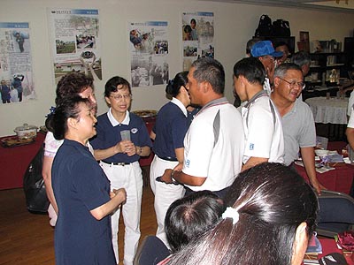 八月八日傍晩志工們合心協力地準備了二十多道色、香、味具全的素食,加上鮮美的水果、甜點,為奮戰了三個多小時後贏得世界冠軍的台灣盲棒隊送行。晩會在陳福民師兄簡單的介紹慈濟基金會後,十九位球員、敎練、隨隊義工一一致詞,會場洋溢著感恩與感動,分享中大家體會到一般人習以為常的小動作,對盲胞而言都是要經由反覆練習的,因此我們更懂得感恩與珍惜,就如球員王兆煕所說:「其實人的需要並不多,但想要的卻很多。」