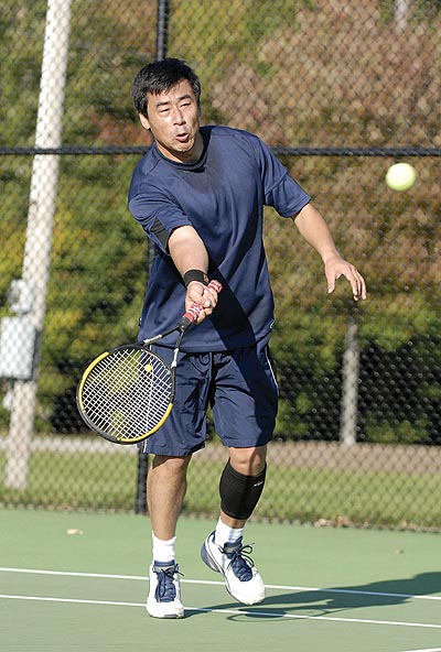 的會員。趁着星期天下午的好天氣,大家都從四面八方的趕來聚集于此,摩拳擦掌,躍躍一試。比賽採用正式比賽規則,由高志強敎授策劃監督。高老師是公認的網球高手,對網球賽事規則頗爲瞭解,爲了增加比賽的競爭度,高敎授主動挑起了總企劃的大樑。沒有到現場觀看很難想象比賽水準之高,選手們你來我往,輕吊重扣,四周的觀摩者一會兒拍手喝彩,一會兒扼腕嘆息。最後的比賽結果終于在近四個小時緊張激烈的對抗中分曉。男子advanced最後由經驗豐富的張永奪冠,賽後採訪時卻大嘆後生可畏。男子intermediate最終由Calvin