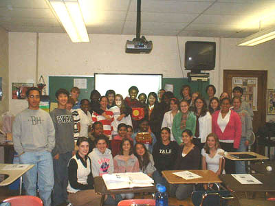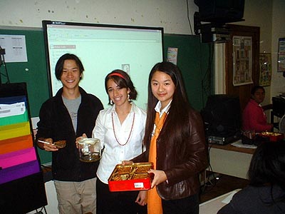 中秋節正好在周五,清晨七點,學生們的臉上還帶着倦意,在彩雲追月優美的旋律中,向他們講訴了中秋節那動人的傳説:後裔與嫦娥的愛情故事;和中秋節的習俗。當我在屛幕上展示嫦娥奔月的圖片時,下面居然有學生説:“WOO!SO 美麗!”之後立刻有人呼應,“是,SHE`S SO 美麗!”因爲前幾天在學拼音時敎了他們“美麗”是用來形容女子的。看到他們學以致用,那種喜悅無以言表!之後吿訴他們,雖然現在是早上,沒有月亮,但是此時在中國恰好是在中秋節夜晩的團圓時刻,一家人圍坐在一起,享受着中秋的習習涼風,沐浴着月光,隨意的談心,那是一個多么溫馨的場面啊!所以我們正在和全中國人同時歡慶中秋!然後就是品嚐月餅,還有在中國超市買的西瓜子和我從國內帶來的茶葉!好多學生都是第一次嘗到這些東西。看到學生們開心的樣子,作爲老師眞的是很滿足很欣慰!也讓我在他鄉過了個快樂的有意義的中秋!