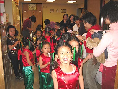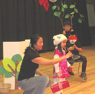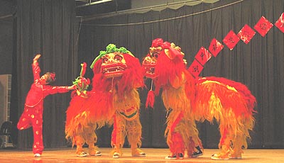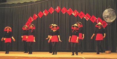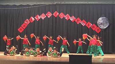 成人舞蹈班中八位中外媽媽在劉仲慧帶領下,表演婀娜多姿的「採茶舞」,不但「採」到觀眾的如雷掌聲,也讓觀眾驚豔;而壓軸的「獅子舞」,更由資深家長葉程耀會犧牲色相,扮演醜婆,逗弄兩隻獅子,趣味十足,節目在大發利市,小朋友分搶糖果中圓滿結束。